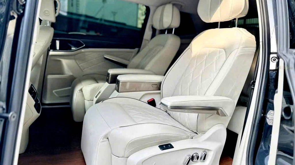 Hàng ghế sắp đặt 2-2-3 ưu tiên hàng ghế thứ 2 hạng thương gia, đầy đủ công năng chắc chắn chiều lòng chủ sở hữu: chế độ sưởi, làm mát và massage, hỗ trợ chỉnh điện & có bệ đỡ chân.